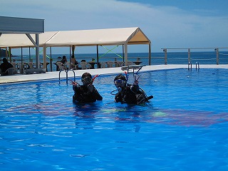 プールの足のつく浅い場所で、スキューバタンクを使って練習します。納得がいくまで何度でも練習してください。そのあとプールの深いほうに行きます。初めての水中無重力感覚を楽しみながらダイビングに必要なテクニックを学びます。